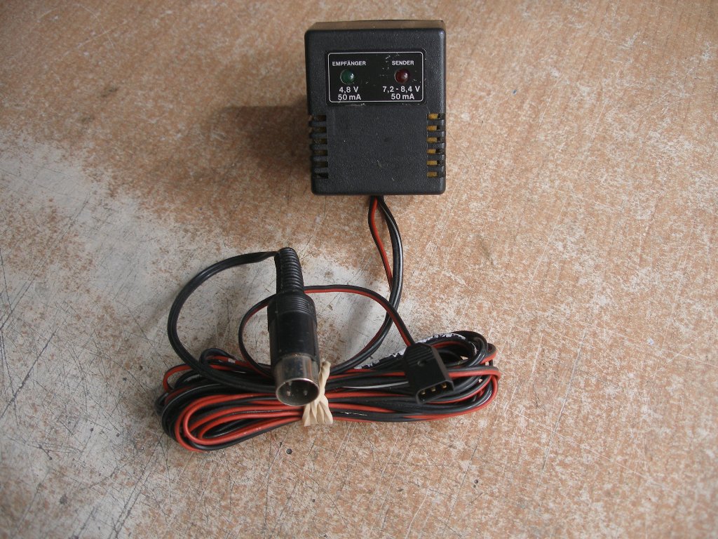 Si nos fijamos en la carátula del cargador indica "Empfänger" (Receptor en alemán) y nos dice que da una carga de 50mAh. a 4,8V, es decir 10% de una batería normal de la época de 500 mAh. y 4 elementos (4x1,2=4,8V). A continuación nos indica "Sender" (Emisor en alemán) y nos dice que facilita una carga de 50mAh. con un margen de va desde 7,2 a 8,4V, lo que corresponde a una batería de 6 0 7 elementos, era una forma de compensar la reducción del voltaje de alimentación al pasar de baterías no recargables (6x1.5=9V) a baterías recargables (6x1,2=7,2V).
