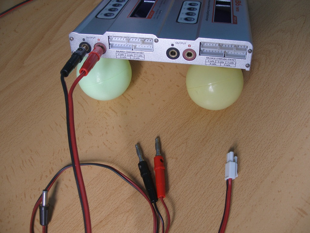 También existen diferentes modos de conexión de la batería con el cargador. Todos los cargadores equipan dos bornes de panel, rojo y negro, para los polos positivo y negativo que es de donde la batería toma su carga. En el caso de cargadores "Dúo" o "Twins", los conectores están duplicados. Se conectan mediante unas bananas, también de panel. Es aconsejable que estas bananas tengan unos flejes a lo largo de su eje para que actúen a modo de muelles y proporcionen un contacto firme y seguro.