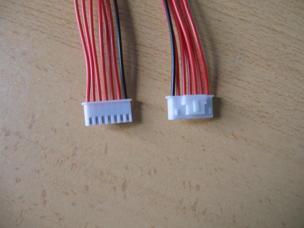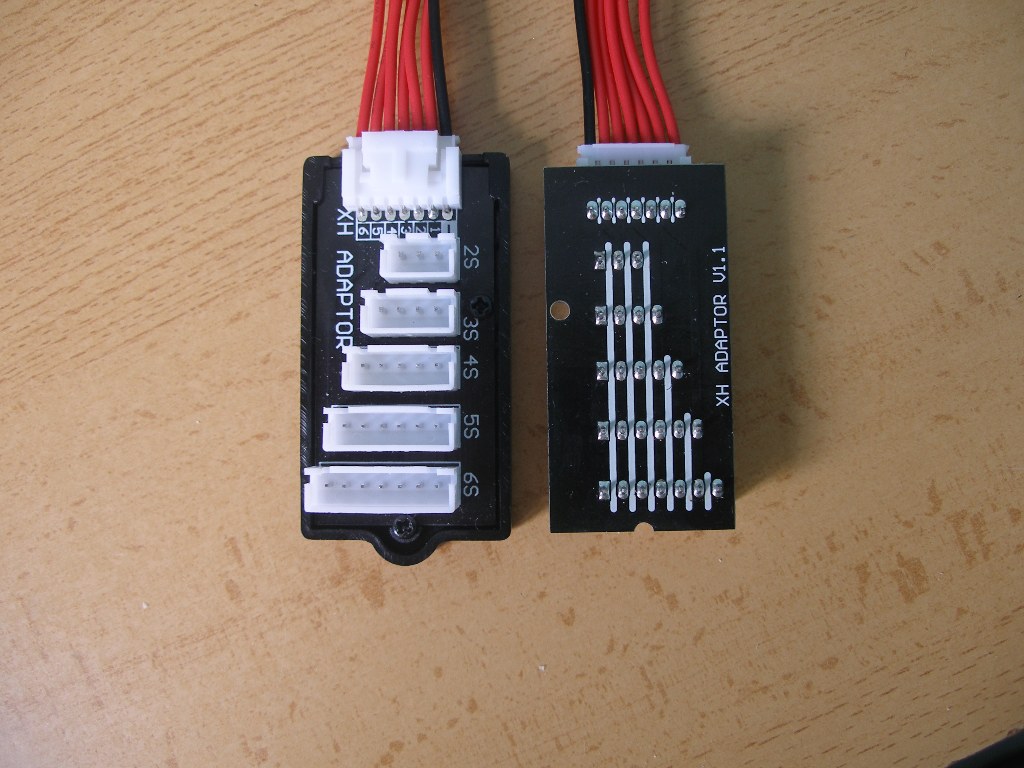 Hay cargadores que tienen un único zócalo JST macho (6S) y un adaptador que admite baterías (2S), (3S), (4S), (5S) y (6S). La imagen muestra un adaptador de este tipo desmontado para poder apreciar ambas caras del circuito impreso,