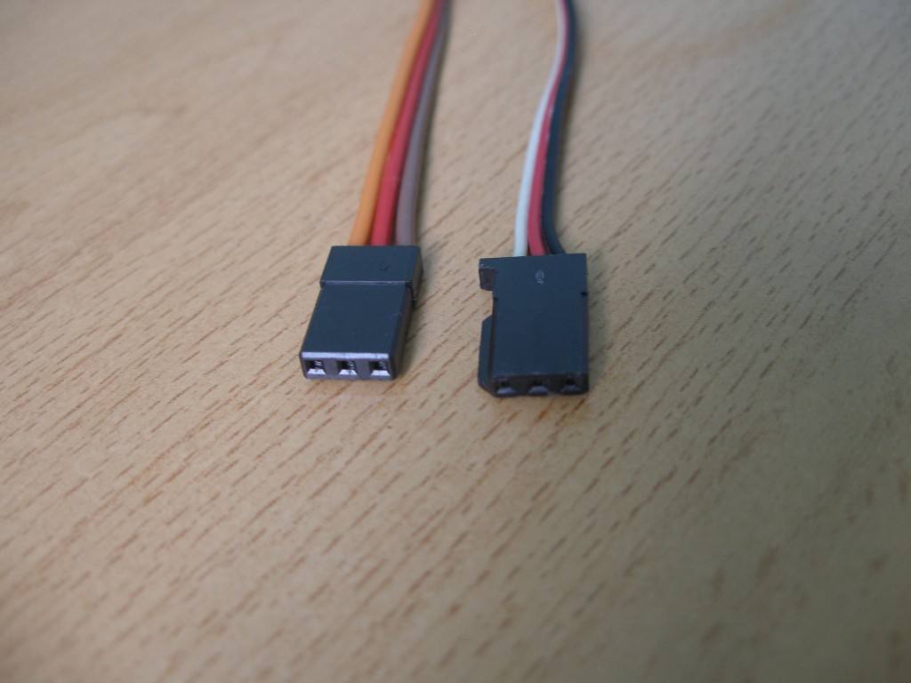 ¿Qué diferencia un conector Futaba de otro cualquiera? Solamente una pequeña pestaña lateral que impide conectarlo en posición errónea. El orden de los cables de cualquier conector de servo siempre es el siguiente: El color rojo que lleva el positivo de la alimentación está situado en el centro. En cualquiera de las dos posiciones posibles de conectarlo, el positivo siempre ocupará la posición central y por tanto no hay peligro de avería. En un extremo irá el cable negro que lleva el negativo y en el otro extremo el tercer cable que lleva la señal. Por tanto si se invierte la posición no ocurrirá nada. Si no funcionase el servo, le damos media vuelta al conector y con toda seguridad el servo funcionará correctamente.