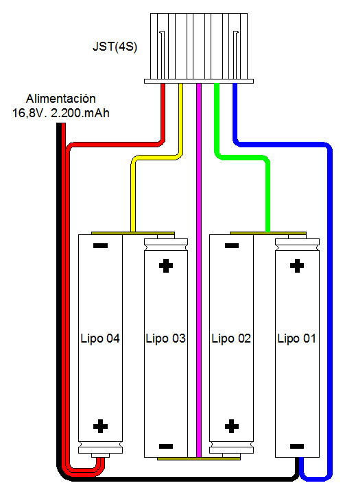 Si entre la vía 1 y 2 conectamos, por ejemplo un motor, éste girará a la izquierda porque el motor cierra el circuito (negativo-positivo) de la LiPo 01 a través de los cables Azul y Verde. Si entre 2 y 3 conectamos otro motor, éste girará a la derecha porque el motor cierra el circuito (positivo-negativo) de la LiPo 02 a través de los cables Verde y Rojo. Cuando conectamos el JST al cargador, el circuito integrado toma la tensión y la corriente de la LiPo 01 y después de la LiPo 02 y espera recibir, porque así está programado, el negativo de la LiPo 01, por la vía 1, el positivo de la LiPo 01, por la vía 2, el negativo de la LiPo 02, por la vía 2 y el positivo de la LiPo 02 por la vía 3.