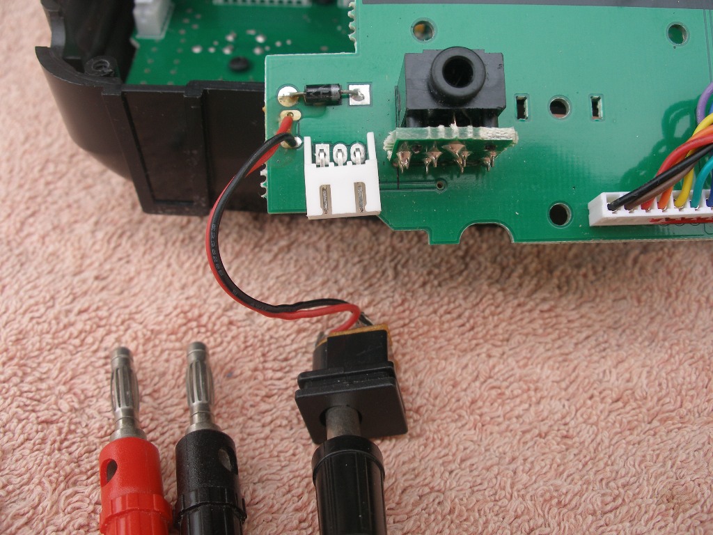 Y es precisamente esta protección la que impide que al cargador le llegue la información de tensión y corriente porque el diodo corta la alimentación a una de las bananas. ¿Se puede solucionar este problema? La respuesta es sí. Hay soluciones sofisticadas, que generalmente no están al alcance del aficionado medio, cuyos conocimientos de electrónica son más bien justitos y para evitar males mayores es mejor acudir a un profesional. Otra solución, sencilla y rápida es soldar un pequeño cable cortocircuitando el diodo como se ve en una de las imágenes. Esta es la peor solución y el peor consejo que se puedan dar. Solución muy drástica, ya que eliminamos la protección y si por un descuido o una mala manipulación cortocircuitamos ambas clavijas el resultado puede ser catastrófico.