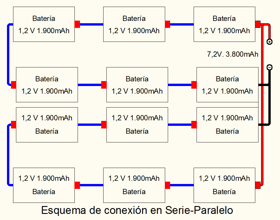 Como el montaje serie propuesto tiene una salida de 7,2V. y 1.900mAh, si montamos estos dos conjuntos en paralelo la salida que obtendremos será de 7,2V, puesto que en paralelo las tensiones no se suman, y 3.800mAh, puesto que las corrientes en paralelo si se suman.