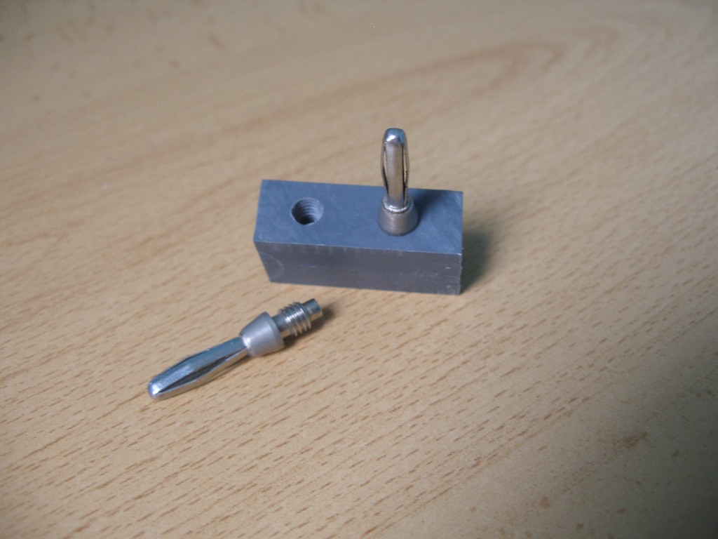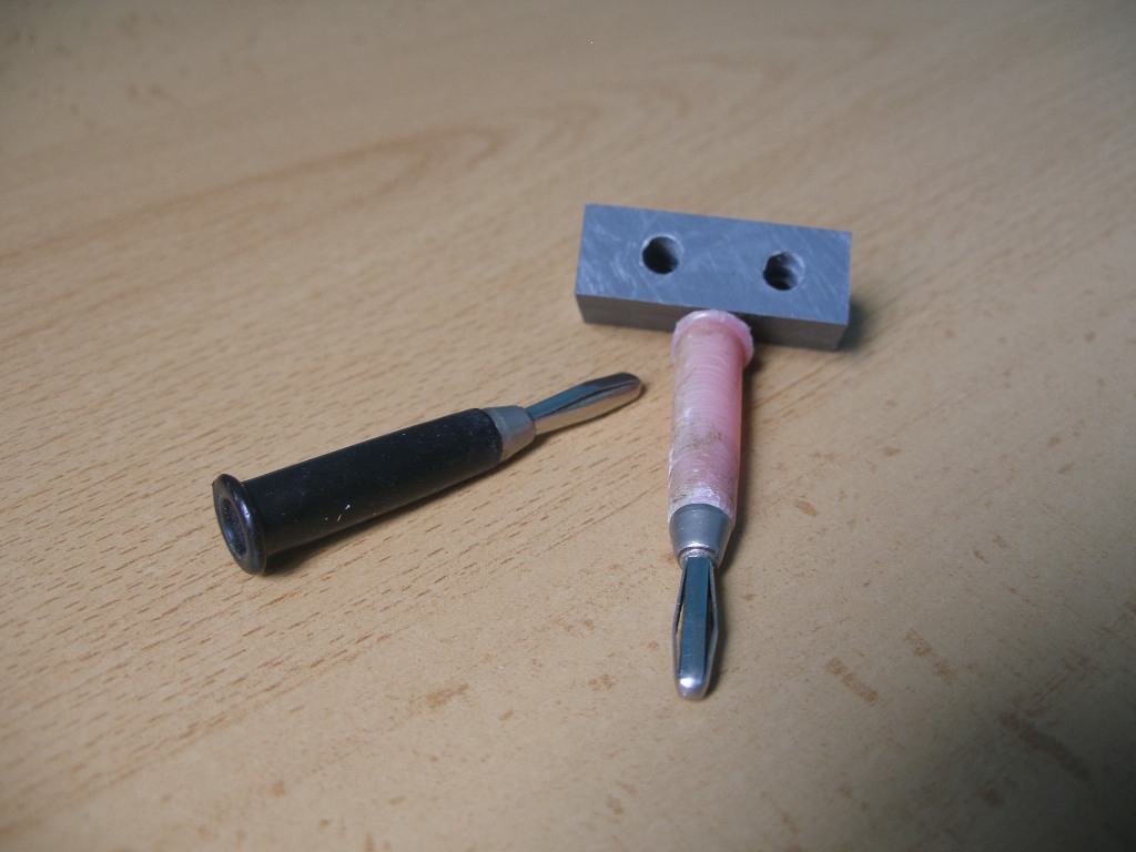 El proceso de construcción no necesita de muchas explicaciones. Tan sólo se trata de hacer una base rígida de material aislante con dos taladros separados entre sí 14 mm. y roscados según el paso de las bananas que vayamos a insertar. En el caso de las imágenes siguientes el paso de rosca de las bananas adoptadas es de M5. Dos trozos de cables, preferiblemente rojo y negro para una fácil identificación de la polaridad y la única, pero muy importante precaución a tener en cuenta es no depositar las bananas bajo tensión en una superficie metálica conductora de la electricidad.