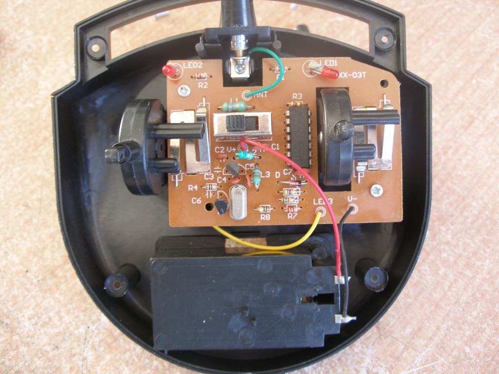 En otra imagen podemos ver la placa base de la emisora, es un circuito bastante complejo, pero con muy pocos componentes, el circuito integrado es el que realiza todo el trabajo y el cristal es el que se encarga de mantener la frecuencia con una estabilidad que, no por estar acostumbrados, deja de sorprendernos por su gran precisión.