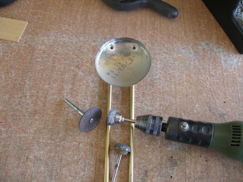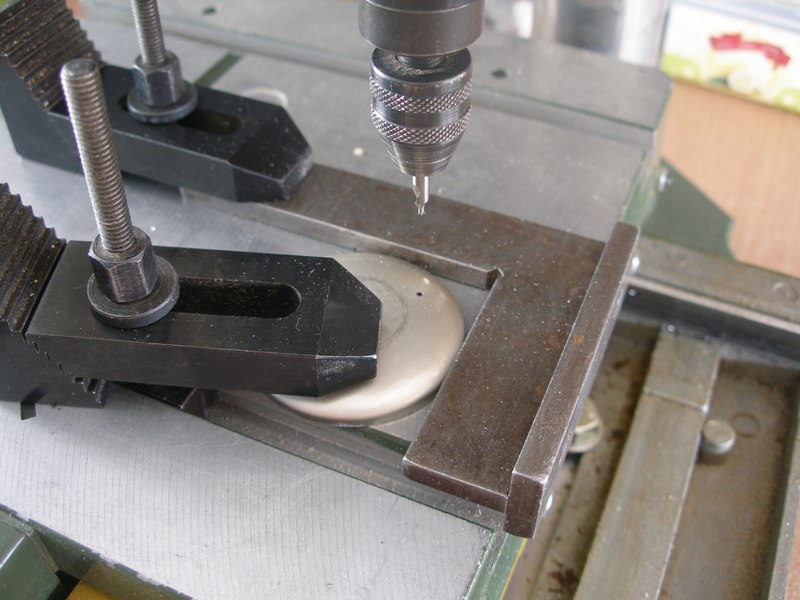 Lo más próximo al borde efectuaremos dos taladros donde irán ubicados los tubos de cuatro milímetros. Como hemos de introducir agua en la caldera a través de los tubos esta posición nos asegura que la cámara de aire, que inevitablemente queda en su interior, sea lo más pequeña posible. Esto puede parecer una tontería, pero tiene su importancia y grande en el rendimiento del motor. El aire que queda aprisionado en el interior de la caldera está a presión atmosférica, el aire es comprensible, el agua no, así que al convertirse el agua en vapor parte de la presión del vapor se “gasta” en igualar la presión de la bolsa de aire.