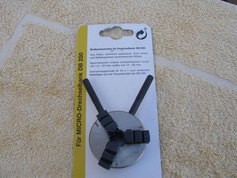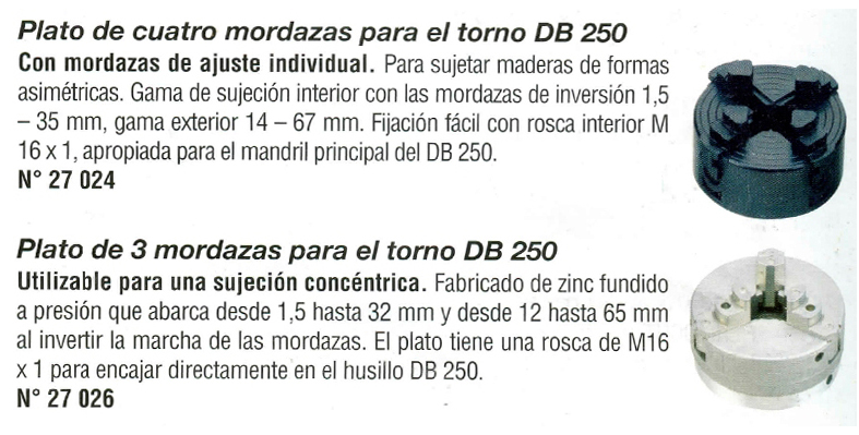 En la sexta imagen podemos ver como el fabricante presenta el plato de tres garras concéntricas. La imagen nos muestra la parte posterior de la cartulina, si nos fijamos en la parte literal de la misma, indica claramente, en alemán, pero perfectamente inteligible, que la rosca del plato corresponde a una métrica 16 x 1 y que se corresponde con su producto DB 250, que es un minitorno.