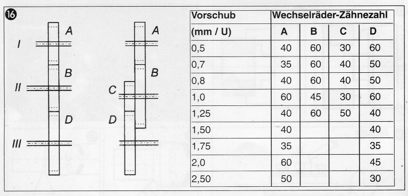Así, pues, vamos a mecanizar el acoplamiento para el plato de tres garras, que también nos servirá si más adelante decidimos incorporar el de cuatro garras. Lo primero que hemos de hacer es preparar el torno. Consultamos la tabla de pasos de roscas y observamos que en la cuarta fila, marcada con "1", -se refiere al paso- nos indica que en los ejes "A", "B", "C" y "D", hemos de poner los engranajes de 60, 45, 30 y 60 dientes, respectivamente, que combinados con los engranajes del cabezal hacen que por cada revolución de este, la herramienta de corte avance, automáticamente, 1 mm. obteniendo una rosca de paso x 1. Los ejes "B" y "C" en realidad son uno y nos indican que la rueda interior es la "B" y la exterior la "C".