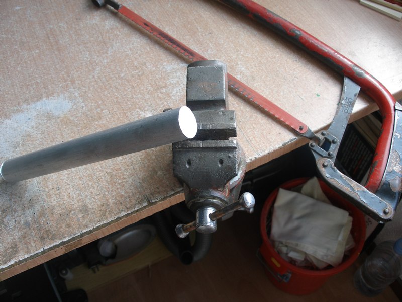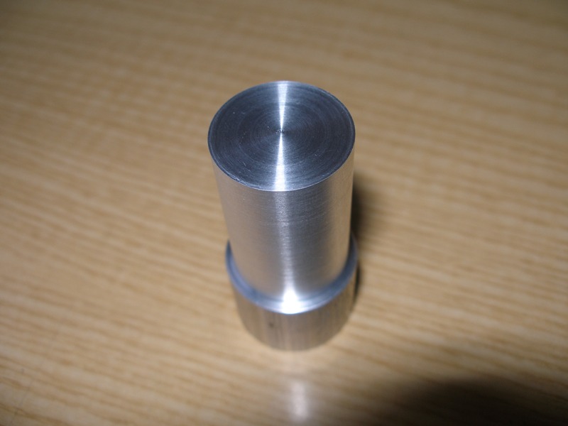 De un redondo de aluminio de 25 mm. de diámetro (hierro, latón, etc. también vale) cortaremos un trozo de 40 mm. aproximadamente, refrentaremos sus caras y cilindraremos su cuerpo a 16 mm.. A partir de este momento no deberíamos sacar la pieza del plato para no perder la concéntricidad. En este caso lo hemos hecho solo a título ilustrativo pero sin tener la pieza terminada.