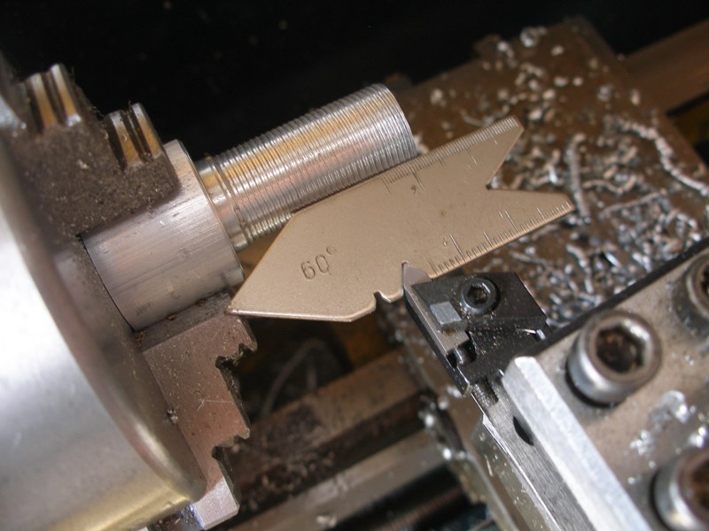 Para que la rosca salga perfecta la herramienta de corte ha de estar perfectamente perpendicular a la pieza que estamos trabajando. Para tener esta seguridad utilizaremos una galga tomando como referencia la propia pieza y una muesca con un ángulo de 60º, que es el ángulo de la rosca métrica, donde ubicaremos la punta de la herramienta de corte y con sucesivos pequeños retoques conseguiremos un encaje perfecto de la herramienta con la plantilla.