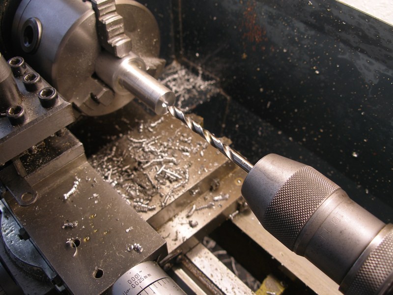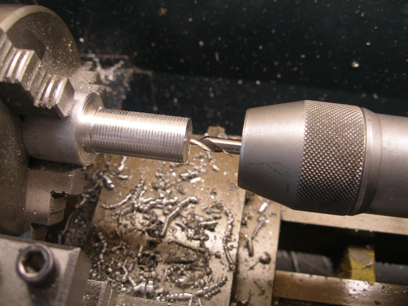 Sin sacar la pieza del plato, con la punta de centrar marcaremos el centro de la pieza haciendo un pequeño cráter donde ubicaremos la punta de la broca evitando que esta pueda resbalar, desviándose del centro y haciendo un taladro imperfecto. La rosca que hemos de hacer es una métrica hembra de 6 x 0.75. Hay una regla para obtener el diámetro de la broca para agujeros roscados y es (Z-p) donde "Z" es el diámetro del tornillo, en nuestro caso 6 mm. "p" el paso, también en nuestro caso 0.75 mm. así pues necesitaremos una broca de 6 - 0.75 = 5.25. Si no tenemos una broca de este diámetro podemos utilizar una de 5 mm. que en metales blandos como aluminio e incluso latón apenas notaremos mayor esfuerzo, pero que en acero nos costará mucho esfuerzo hacer correctamente la rosca, corriendo, incluso, el riesgo de romper el macho de roscar y echando a perder todo el trabajo realizado.