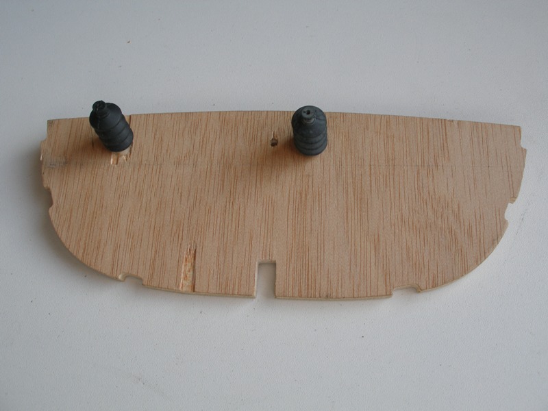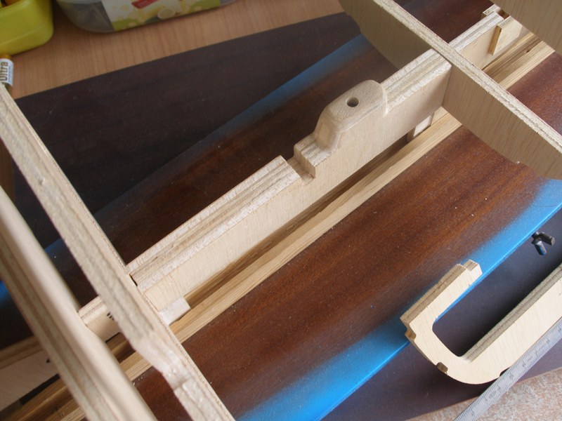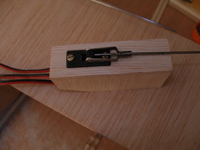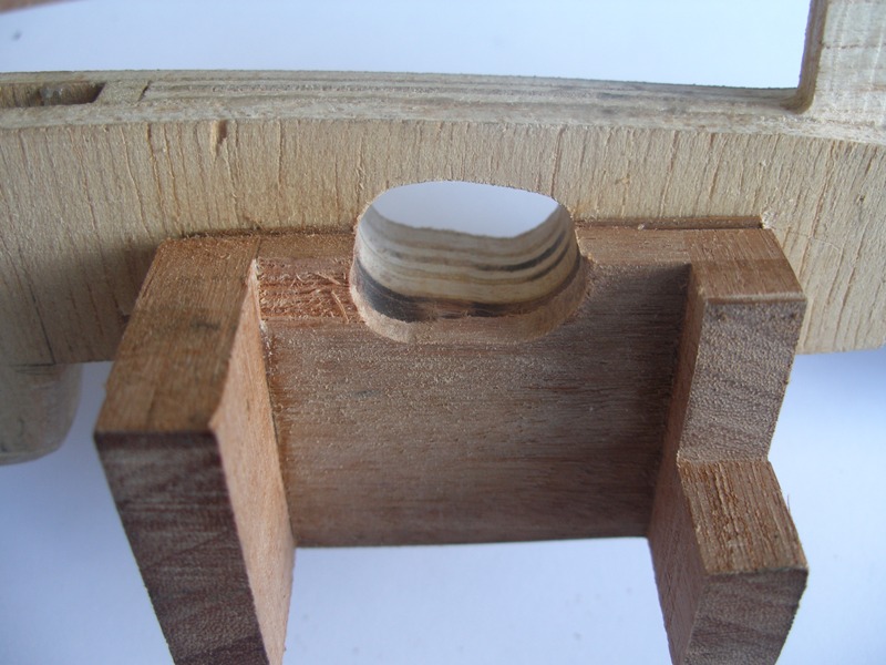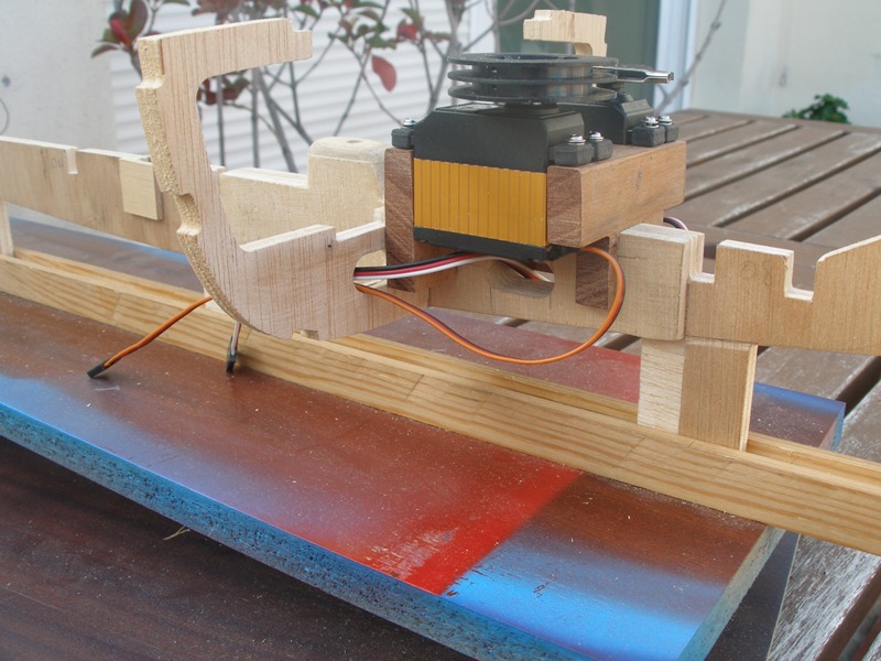 Pegamos la bancada de servos definitivamente y cuando la cola hubo secado por completo nos dimos cuenta que la abertura practicada en la quilla quedaba parcialmente tapada, así que tuvimos que rebajar la bancada a pulso ya que no nos fue posible apoyar la quilla de manera firme. Obsérvese la imperfección del arreglo.