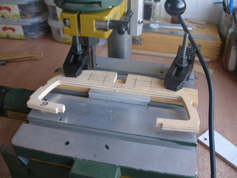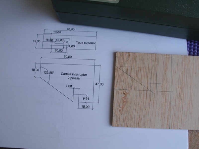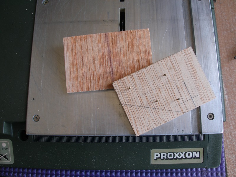 En la otra imagen y también en las siguientes podemos apreciar el proceso de construcción de la bancada para el interruptor. Como necesitamos dos piezas exactamente iguales, para ahorrar trabajo, hemos clavado dos trozos de contrachapado de 3 mm. y con un sólo corte hemos obtenido las dos piezas que necesitamos para la bancada del interruptor.