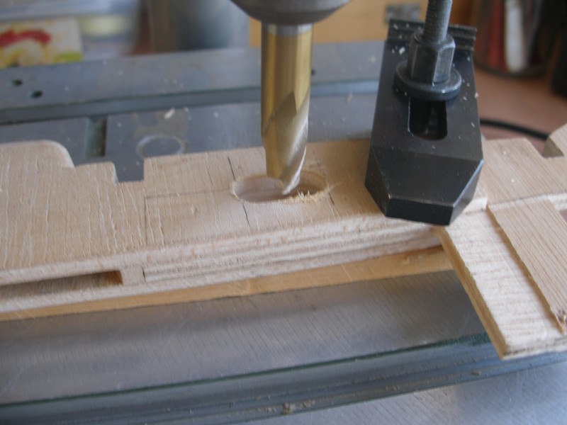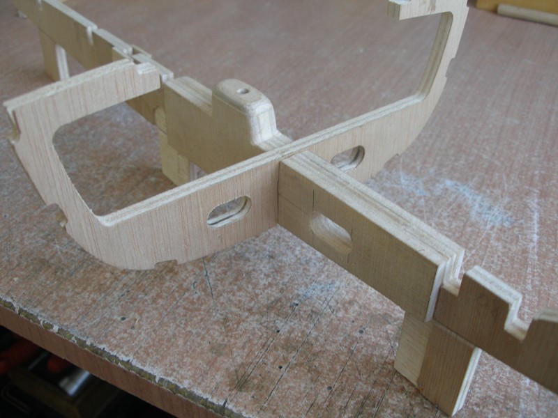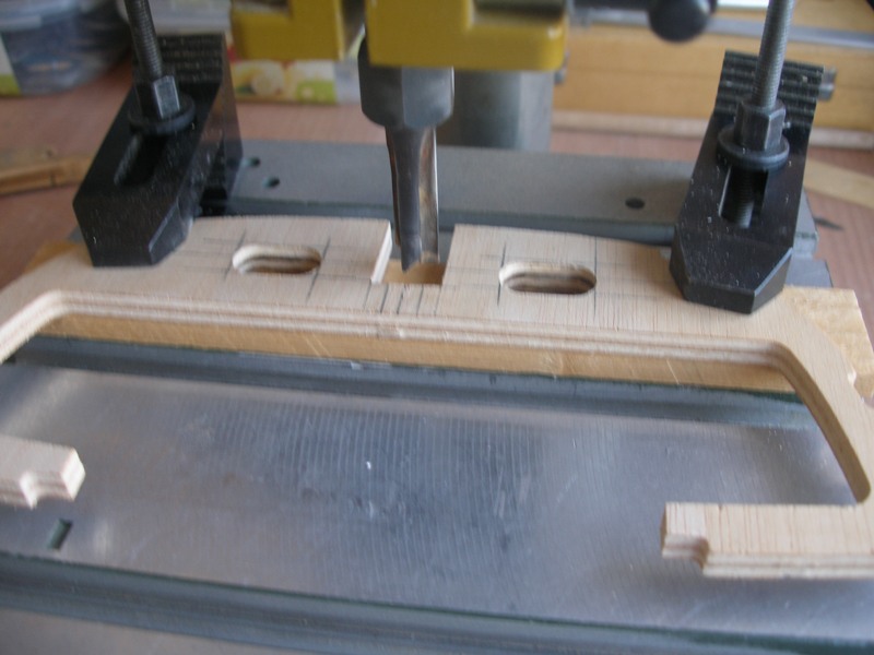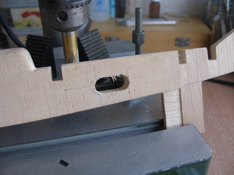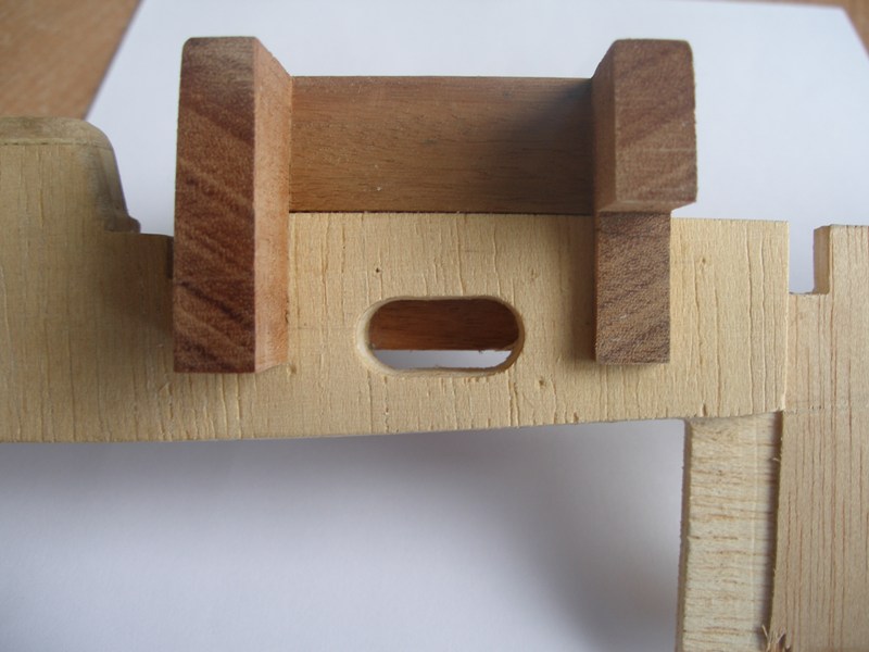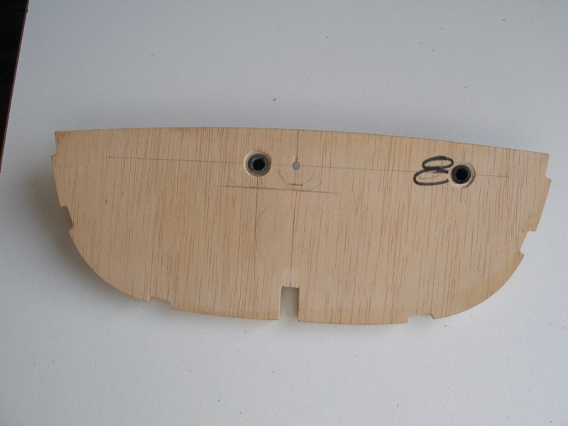 Así que ahora, que tenemos todas las piezas sin encolar, es el momento para practicar unas aberturas en la cuaderna número 6, una en la parte de estribor y otra en la de babor. Estas aberturas nos permitirán correr los cables en el sentido proa - popa. Asimismo practicaremos otra abertura en la quilla, lo que nos permitirá pasar un cable en el sentido estribor - babor. La abertura ha de tener las dimensiones suficientes para permitir el paso de los conectores. No hace falta decir que la abertura de la quilla debe hacerse dejando suficiente franquía a la caja de orza.
