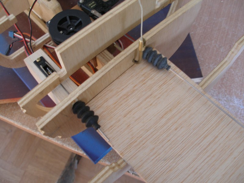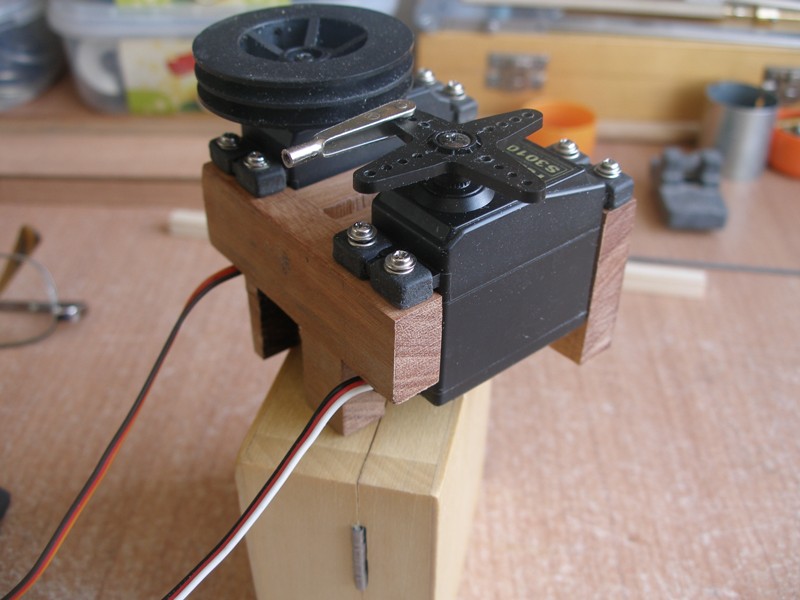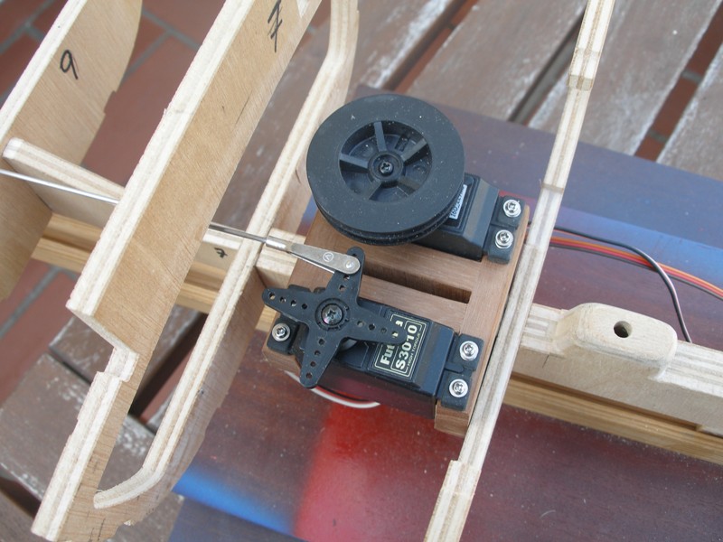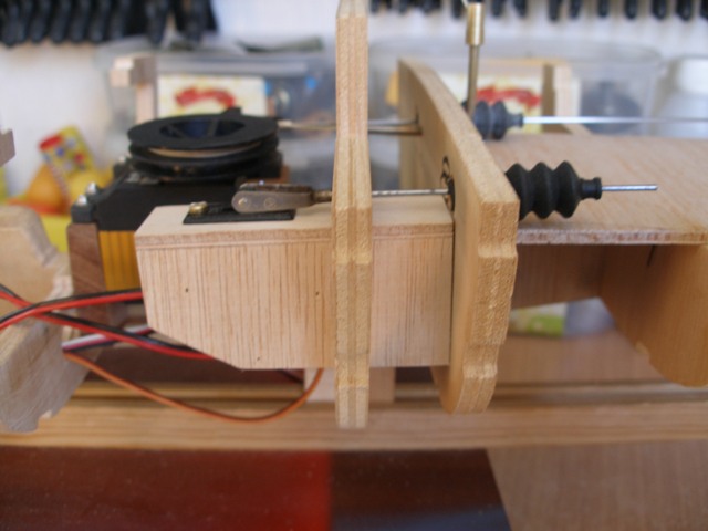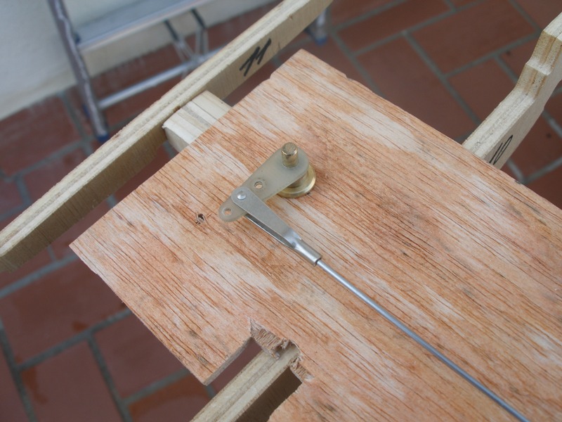 En las imágenes precedentes podemos apreciar los detalles de instalación de ambos servos y su forma de trabajar. Hemos improvisado una falsa cubierta de la bañera para tener una visión real del paso de la varilla del mando del timón.