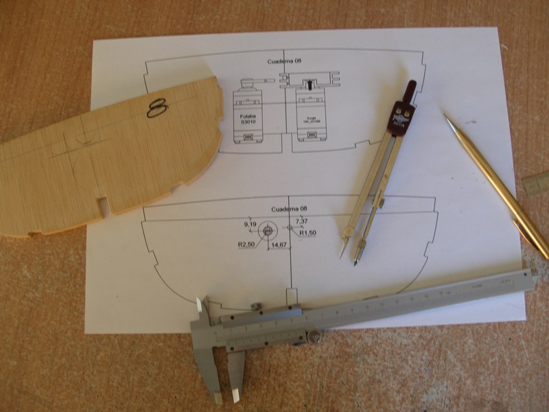 El plan de trabajo para esta fase será terminar de mecanizar las cuadernas números 6 y 8 y la quilla, haciendo unas perforaciones para permitir el paso de los cables de alimentación y señales de los servos y construir y montar las bancadas de servos e interruptor.